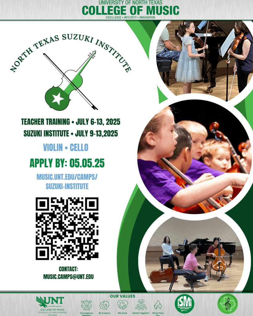 The North Texas Suzuki Association exists to coordinate, support and publicize Suzuki events in North Texas. We promote Suzuki teaching and training among teachers, parents, students and the general public. The highest standards of excellence in teaching and playing are encouraged among our members. NTSA also serves as a vehicle for communication among Suzuki teachers and fosters growth of the Suzuki philosophy in Texas.